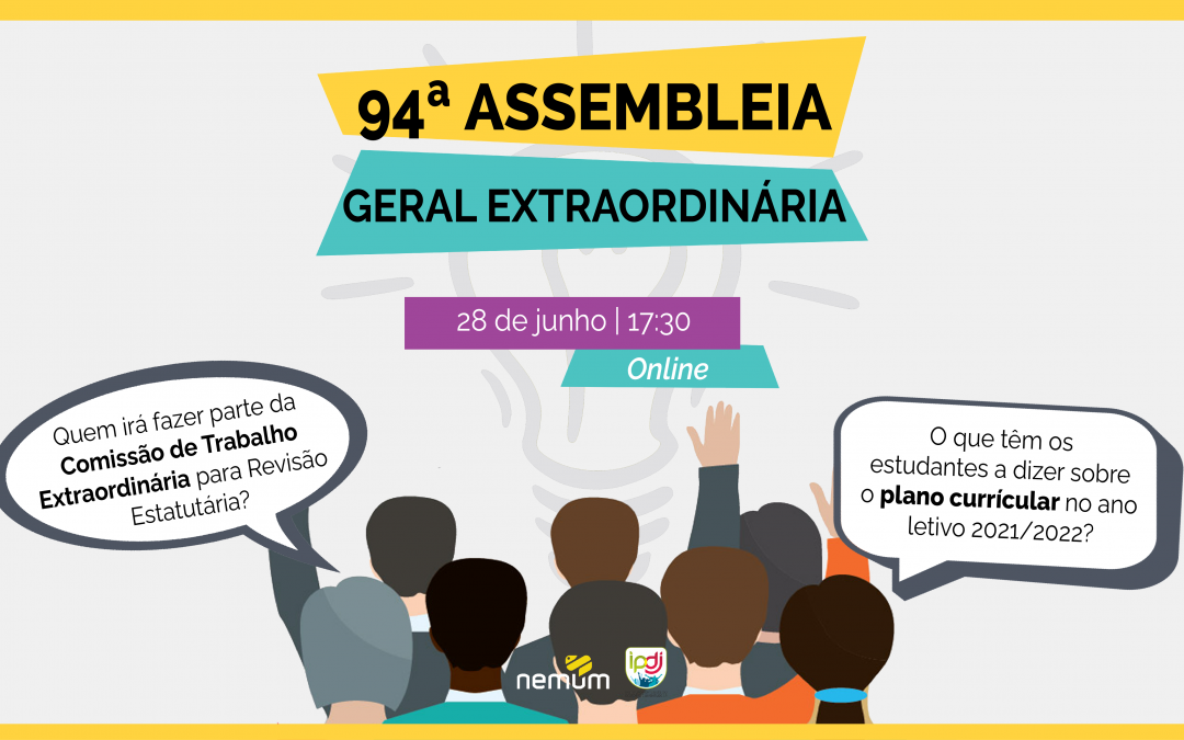 De acordo com o disposto nos estatutos do NEMUM, a MAG convoca os/as estudantes do MIMED da EM-UM a participar na 94ª Assembleia Geral (AG), de caráter extraordinário, a ter lugar no próximo dia 28 de junho de 2022 (terça-feira), pelas 17h30, via Zoom® (o link de acesso será fornecido, posteriormente, via e-mail institucional, website da MAG e redes sociais/Linktree do NEMUM.).